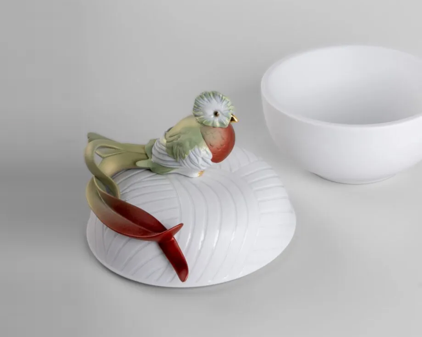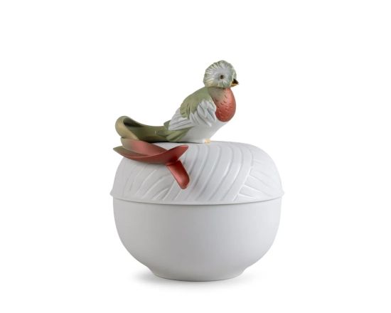 "Бұл функционалды заттар тропикалық ормандардың әдемі жаратылыстарымен безендірілген. Quetzal Box қорабында құстардың түсінің байлығы күңгірт ұстағышпен және қақпақтағы гравюраны баса көрсететін лакталған бөлшектермен ерекшеленеді. Ол люстралармен және түстердің кең ауқымына жарқыраған металл пигменттермен безендірілген. Керемет қорапты өңдеу және керемет кветцал бөлшектері тамаша контраст ойынында үйлеседі және үйлеседі". Бұл бөлікке сақтандыру кіреді Салмағы: 3,65 кг Аяқтау: атласты күңгірт