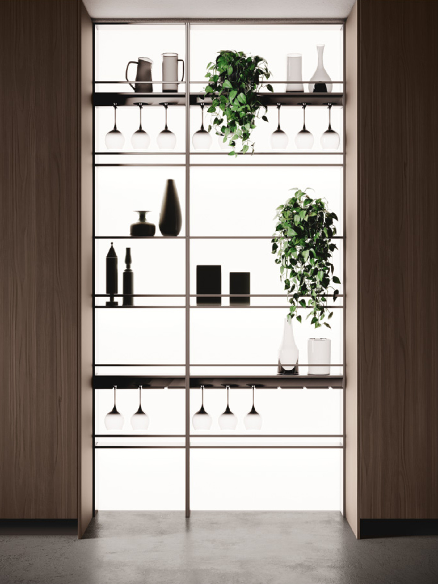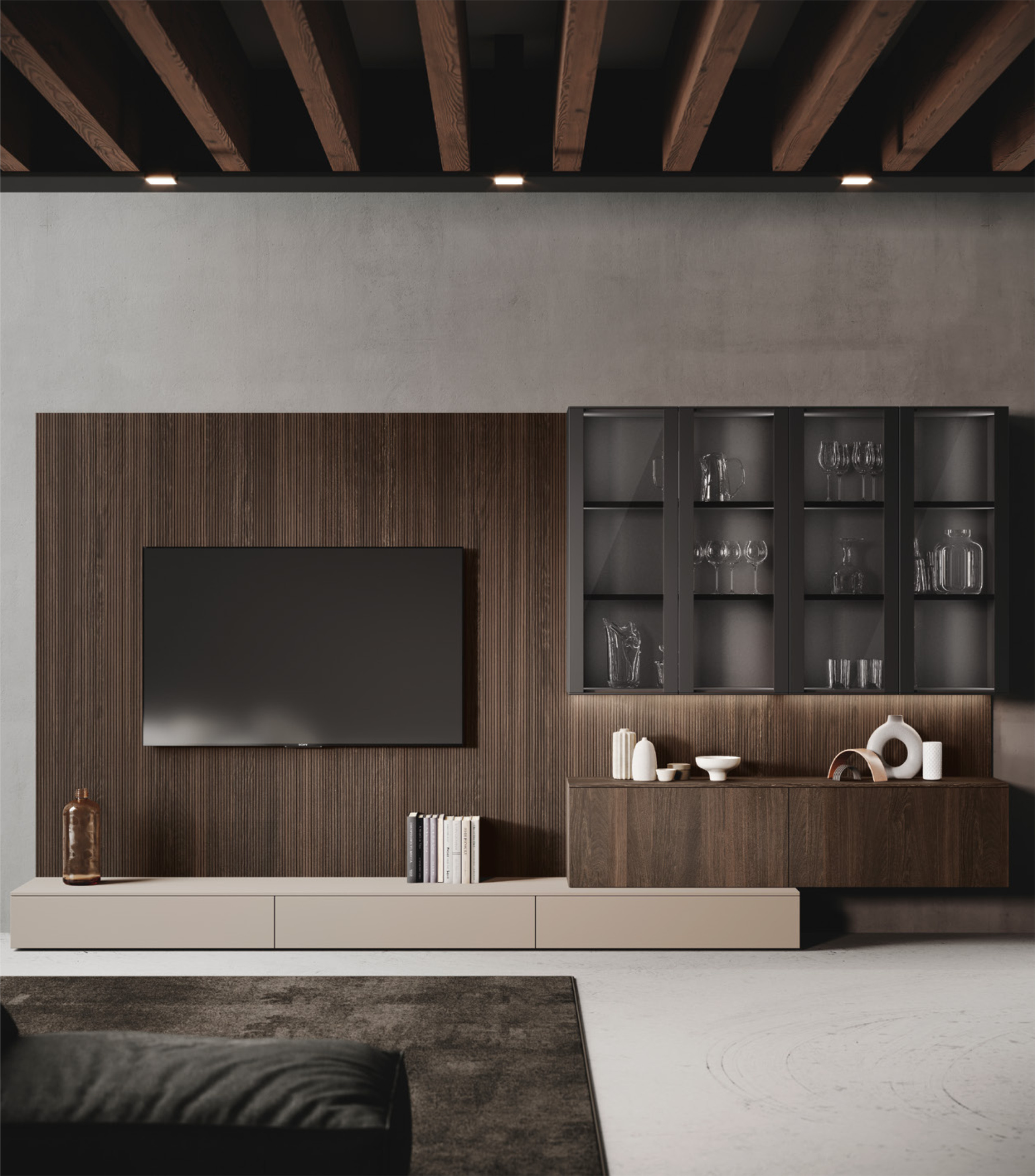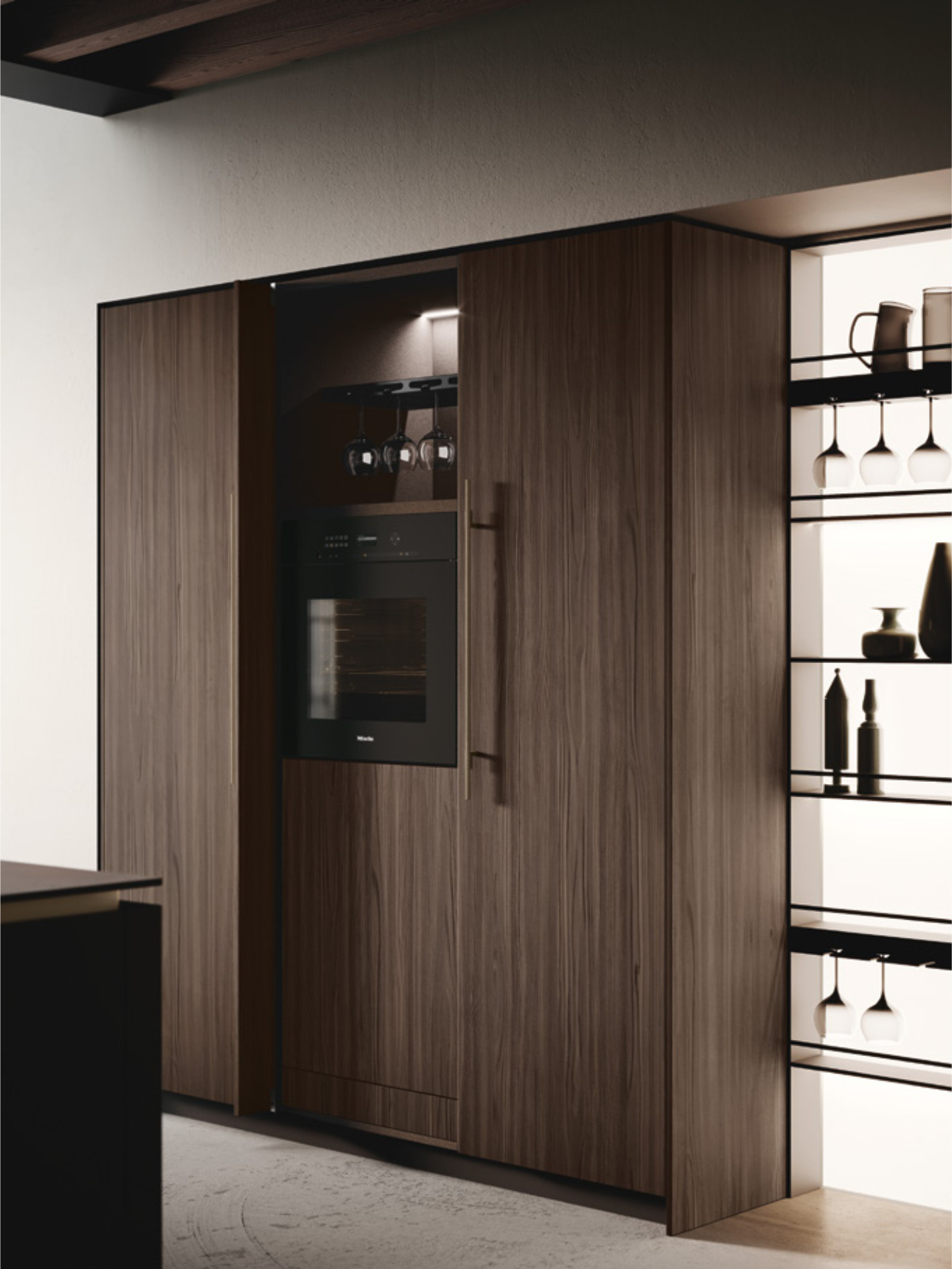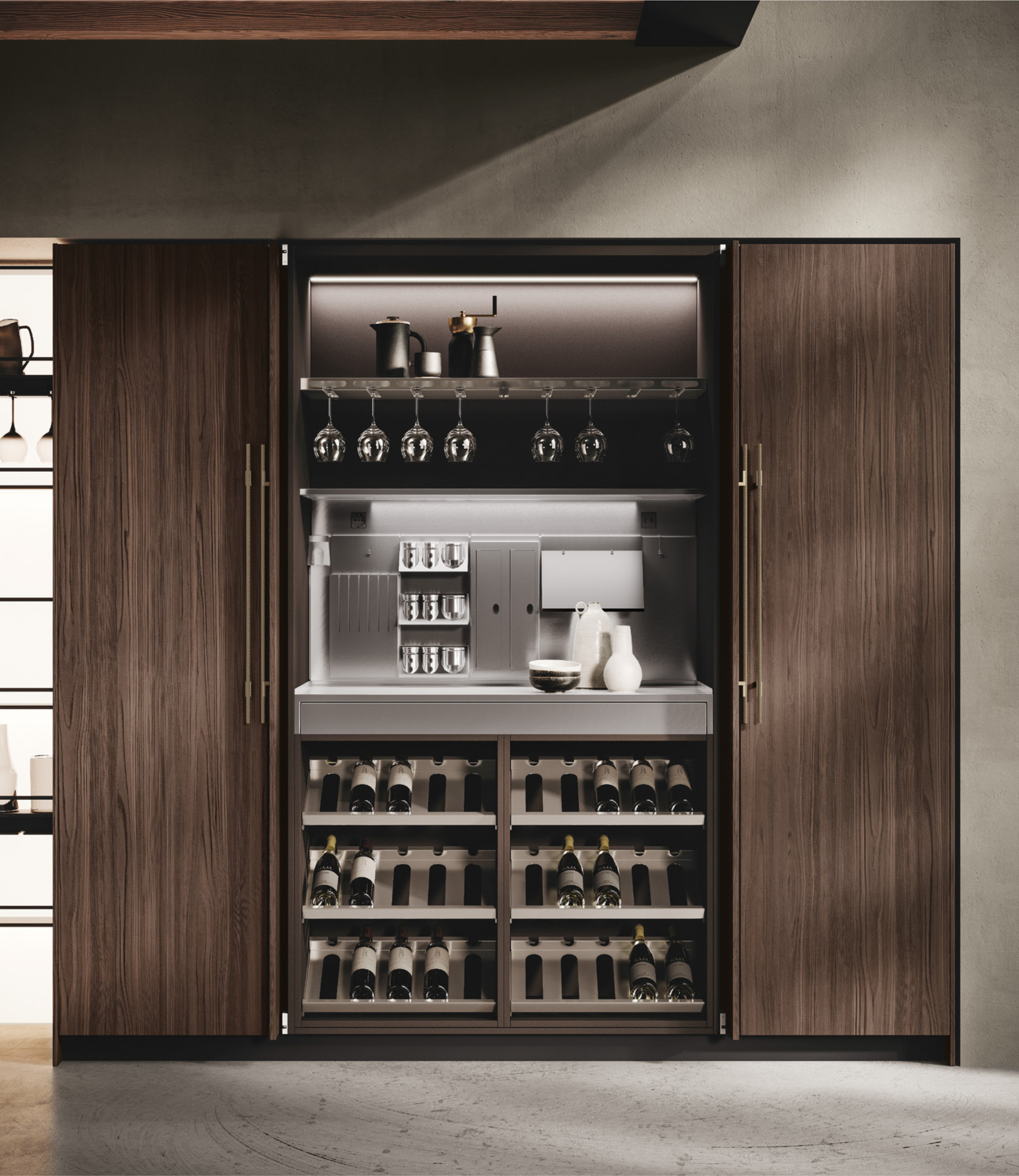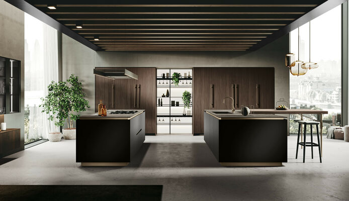 Бүкіл параметр талғампаз симметриямен тыныс алады, ал қола жылтырлығы күрделі қара материалдар мен әрлеуді көрсетеді. Орталықтандыру тұжырымдамасы екі жағынан тартылатын есіктері бар шкафтармен толықтырылып, таза алдыңғы сызықтар жасайды және осы кең бөлменің жұмыс аймағын құрайтын жарықтандырылған Combo Line орталық жүйесі.