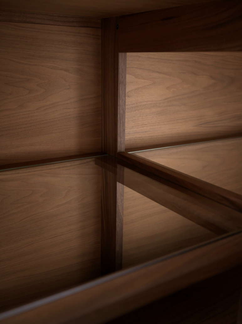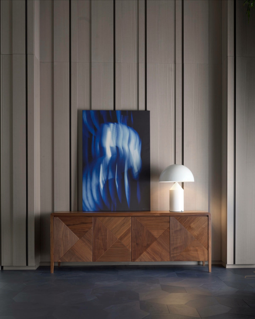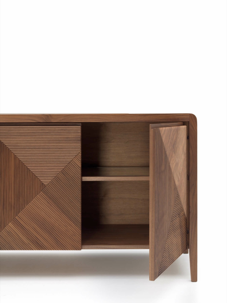 Бұралмалы есіктері бар қатты жаңғақ шкафы дөңгелектелген бұрыштармен жұмсартылған құрылымның айқын дизайнымен ерекшеленеді. Ол сондай-ақ relevo Boiserie геометриялық текстурасынан шабыттандырылған үш өлшемді қасбеттермен ерекшеленеді: тік және көлбеу сызықтар, ағашты мұқият өңдеудің нәтижесі, керемет үш өлшемді көрініс жасайды. Шкаф Noce Solista, ca' Conti, Gray 01, Ca' Selva және Color sense түстерінде қол жетімді, бұл оны әртүрлі интерьер стильдері үшін тамаша шешім етеді.