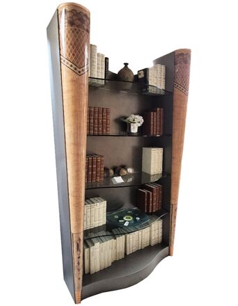 Табиғи ағаштан жасалған мөлдір шыныдан жасалған фигуралы сөрелері бар биік ашық кітап шкафы. Табиғи жаңғақ ағашынан жасалған биік конустық бүйірлік бағандар бағалы ағаш түрлерінің ою-өрнегімен өрнектелген.