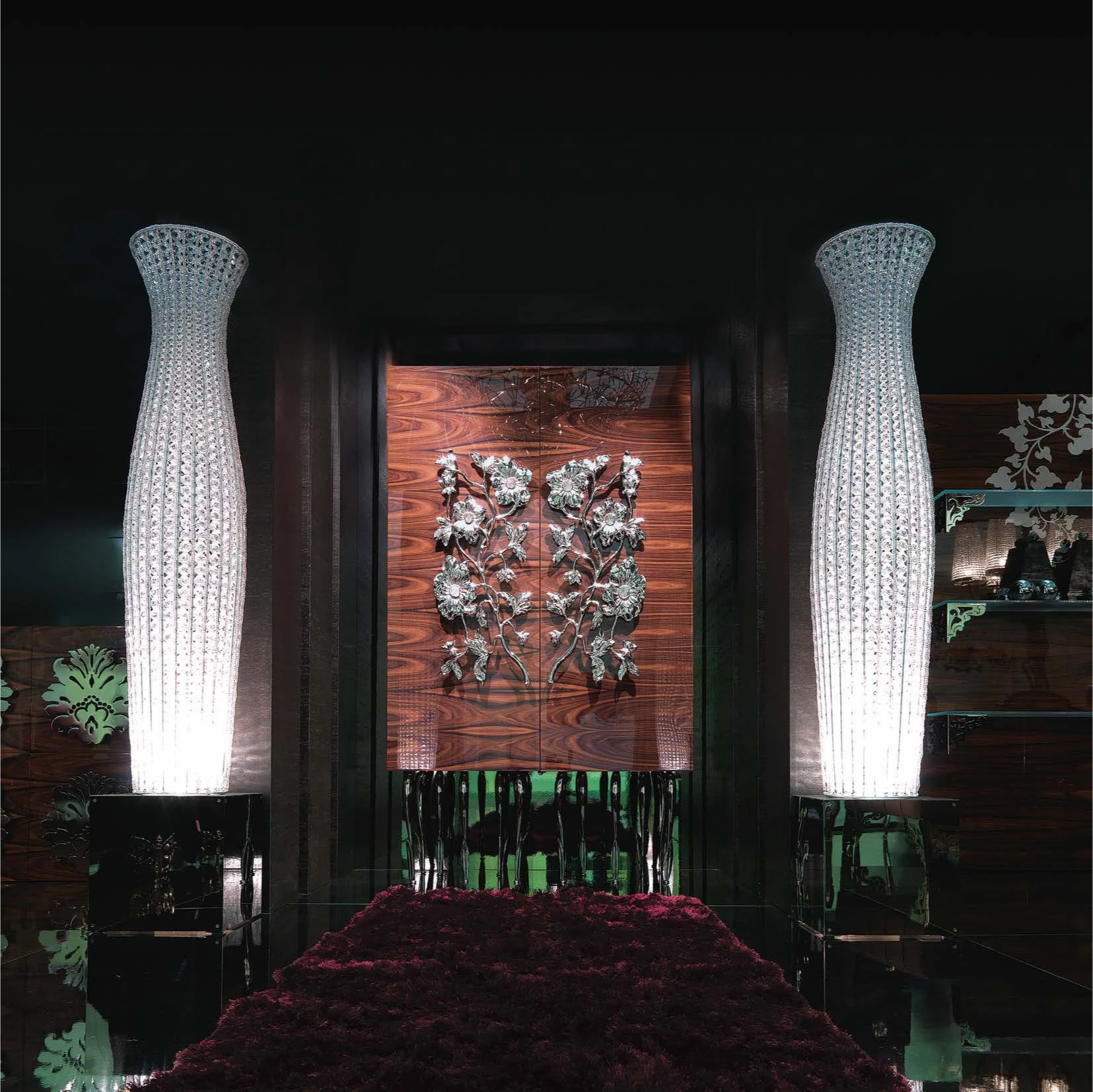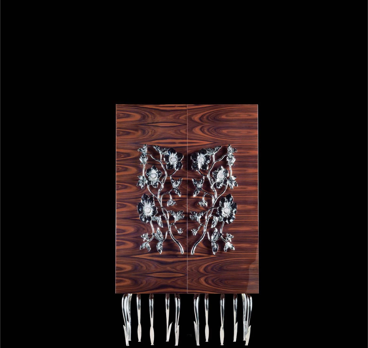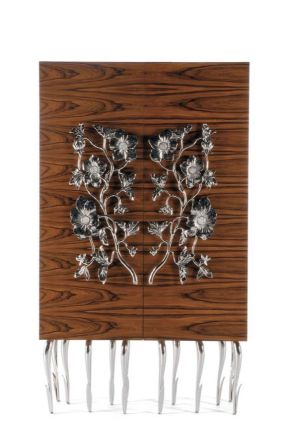 Қатты раушан ағашынан жасалған гүл шкафының корпусы, ішінде екі раушан ағаш сөресі бар. Никельмен қапталған жезден жасалған аяқтар, клиенттің қалауы бойынша әрлеу. Аяқтау-компанияның ассортиментінен күңгірт немесе жылтыр лак. Алтын Жинақ. Түстер қол жетімді.