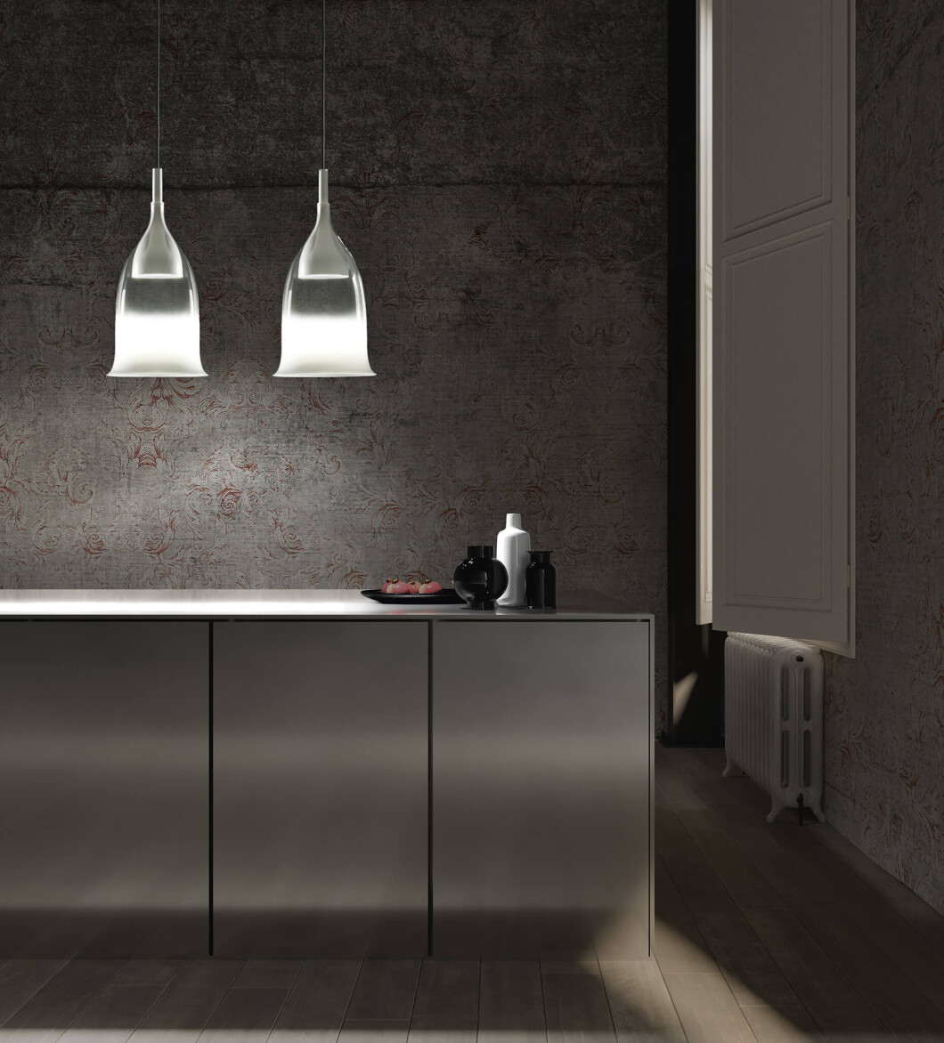 Алтын немесе ақ реңктері бар шыны кулон. Күңгірт ақ, ашық алтын немесе сұр болаттан жасалған металл құрылымы.
